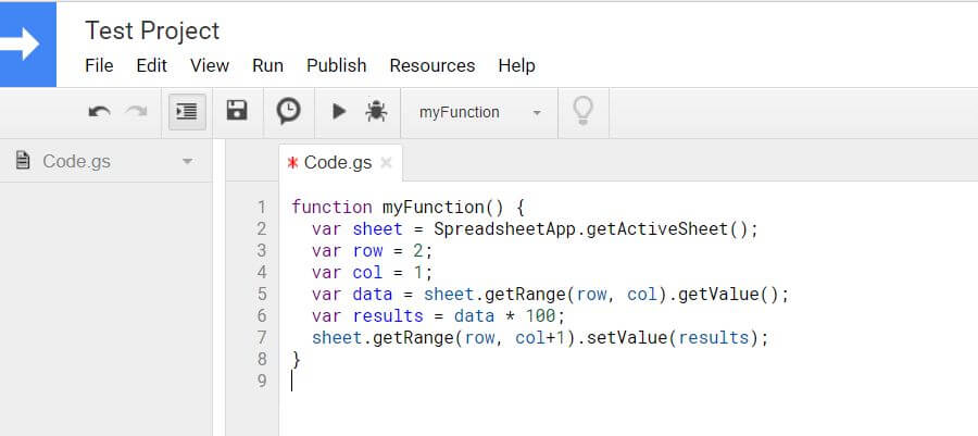 This stores the value from that cell in the data variable. You can perform a calculation on the data, and then write that data to another cell. So the last part of this function will be:var results = data * 100; sheet.getRange(row, col+1).setValue(results); }