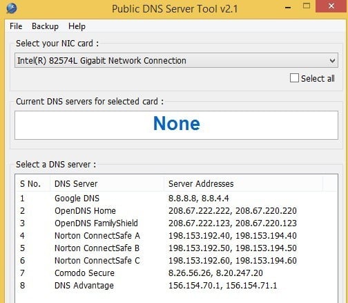 Public DNS Server Tool has a smaller list of servers than DNS Jumper and ChrisPC DNS Switch, but it’s got a lot more than the one in QuickSetDNS. Again, though, this program does not have any way to test the speeds of the DNS servers, which is why my favorite is DNS Jumper. You can backup and restore the DNS settings in this program, but you have to manually do it and it saves the file out as a registry file.