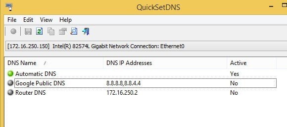 QuickSetDNS is from my favorite company, Nirsoft. These guys are always coming out with crazy useful tools and QuickSetDNS is one of them. The program is great and works all the way up to Windows 8 64-bit, but for whatever reason they decided to only include one option in the public DNS list! If you only plan to use Google Public DNS, it’s fine, but it would have been nice if they added at least a couple more popular options. You can manually add entries and it’s only a one-time task, but it’s still not something the user should have to do.