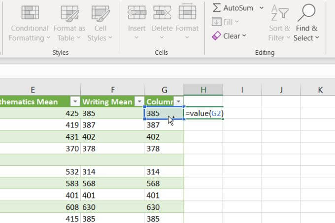 You can then fill the rest of the empty column to the bottom of that column and the VALUE formula will convert the rest of the cells in the original column as well.