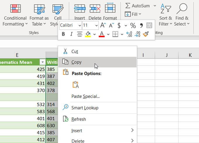 - Select the entire column of cells you want to convert from text to numbers, right-click, and select Copy.