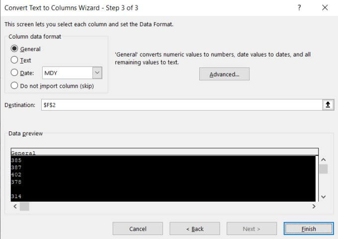 - Finally, on the last page of the Wizard, make sure General is selected under Column data format. For the Destination field, you can either select a new column where you want the number data to go, or just keep the current selected column as is. Select Finish.