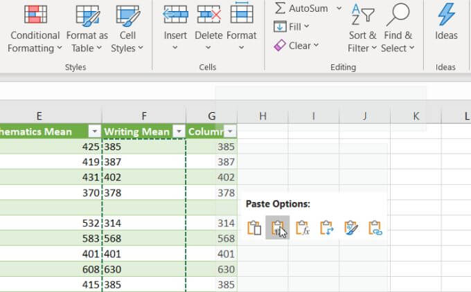 - Select the first cell in the empty column you formatted, right-click the cell and select Paste Values. You’ll see all of the text formatted numbers pasted in the General number format.