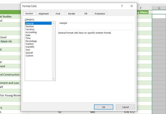 - In the window that opens, make sure General is selected as the number format and select OK.