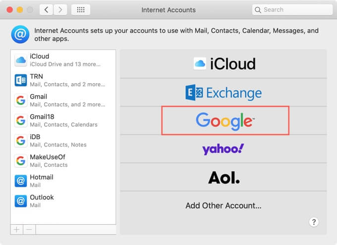 - Choose Add Account and then pick Google.