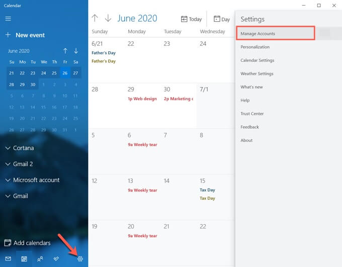 - * Open the Calendar app and click the Settings button (gear icon) on the lower left.