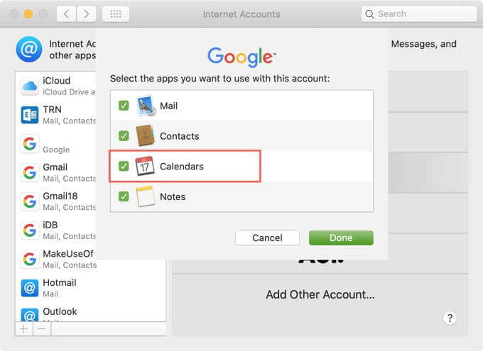 - Open the **Calendar** app and then click **Calendar** > **Accounts** from the menu bar. * Choose your account type, which would be **Google** for your Google Calendar. * When you see the pop-up message instructing you to complete the process on the web, click **Open Browser**. * Sign into your Google account. * Once you successfully connect to your Google account, you’ll receive a prompt to pick the apps you want to use for it. Check the box next to **Calendar** and optionally others, if you like. * Click **Done**.