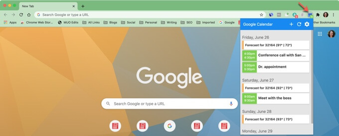 Google Calendar for Chrome is another convenient extension. This tool obviously only works with Chrome, but once you install it, you can see what you have on your agenda for the day with the toolbar button. And you can add events with the plus button at the top.