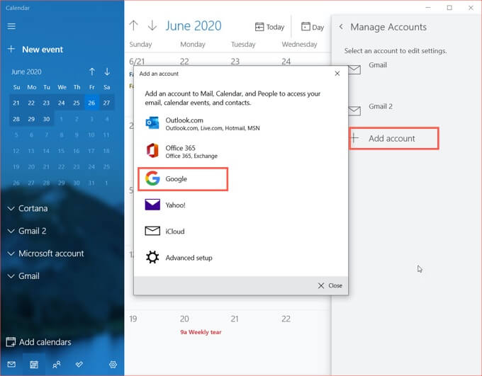 Your Windows computer comes with a default calendar that lets you connect a Google account in addition to other types of calendars. If you’re using the Calendar application for the first time on Windows, follow the prompts to get set up.