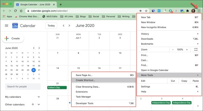 - Open **Google Calendar** in Chrome and sign in. * Click the **Customize and Control** button on the top right of the Chrome window. * Select **More Tools **>** Create Shortcut**. * **Name** your shortcut and click **Create**.
