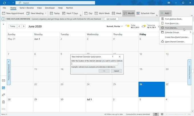 - In the left-hand sidebar, click the **Options** button (three dots) next to your calendar and pick **Settings and sharing**. * On the next screen, scroll down to the **Integrate calendar** section. * Copy the link in the **Secret address in iCal format** box. * Open **Outlook** on your computer and select the **Calendar** with the button at the bottom of the left-hand sidebar. * Click the **Home** tab and then **Add** in the ribbon. * Choose **From Internet**. * When the small window pops open, paste in your iCal link and click **OK**. * Confirm you want to connect the calendar by clicking **Yes**.