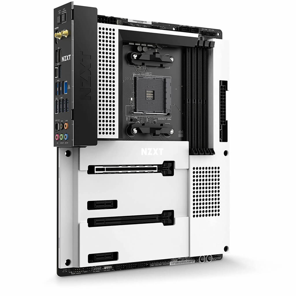 NZXT N7 is well known for its Intel motherboards, with their unique white theme and clean look. The NZXT N7 B550 is their first AMD motherboard and boasts of the same aesthetics and RGB-free appearance.