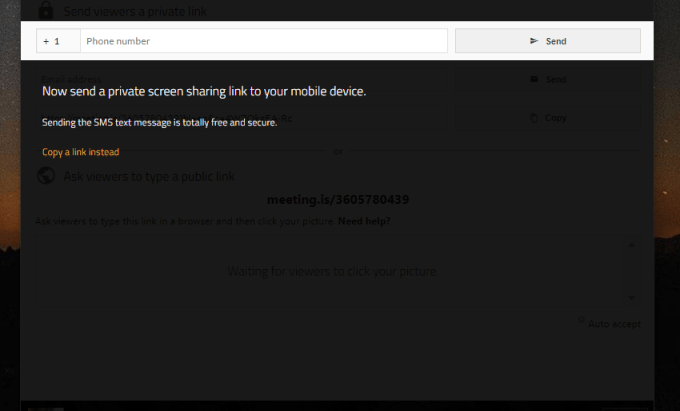 There are two ways to share the screen. You can either type in the other user’s phone number and send an SMS with the share link, or you can copy the share link and email it or IM it to the remote user yourself.