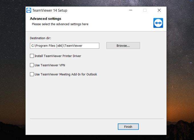 If you’ve selected Advanced Settings in the previous setup screen, you’ll have the option of enabling some of the advanced features that come with TeamViewer. These include including a printer driver to remotely print, a VPN feature, or an add-in to enable TeamViewer sessions from inside of Outlook.