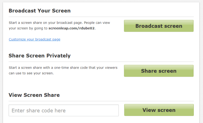To share you screen out using this app, you have two options from Screenleap.com. You can select Broadcast screen and share out your desktop to anyone who has your URL link (requires that you sign up for an account with your email). Or, you can select Share screen to immediately share out your screen and get the code to send to the person you want to share your screen with.
