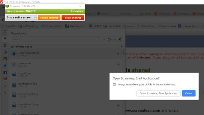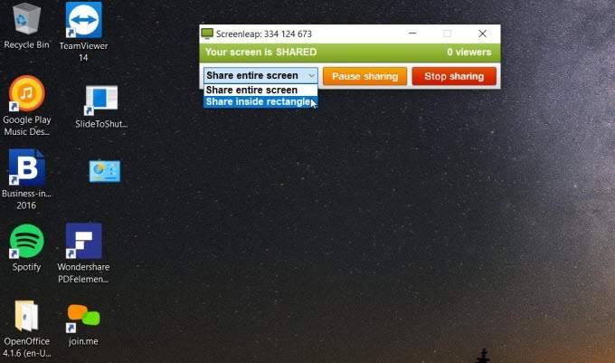 If you really don’t want to install a full-fledged application on your computer just for the purpose of screen sharing, Screenleap is a good solution. It installs as a Google extension and allows you to quickly share your screen with anyone over the internet in just seconds.