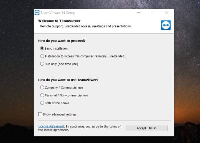 When you first download and run the TeamViewer installer, you’ll have the option to set up a full version (Basic installation), or just set it up as a service (unattended) for remote access from another computer.