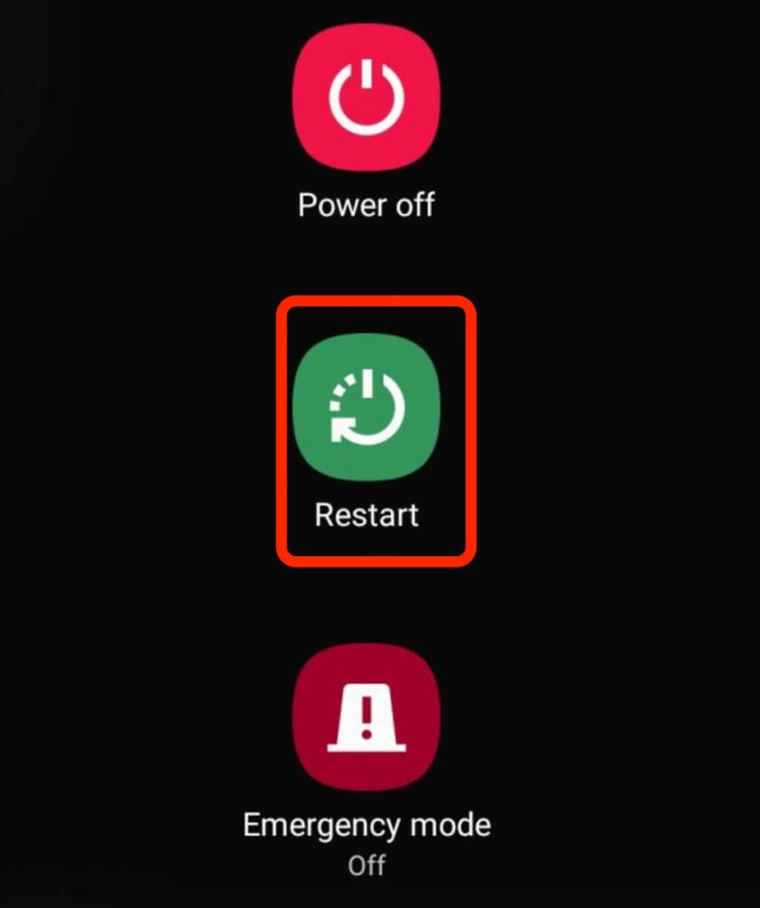 - Android: Press and hold the Power button and then tap the Restart option twice.