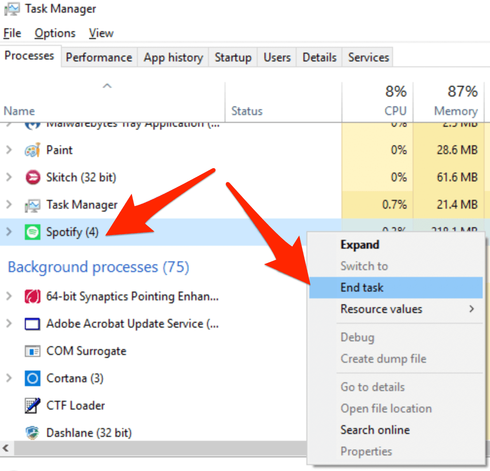 - On your Windows PC, right-click the taskbar, select Task Manager, right-click Spotify, and select End Task.
