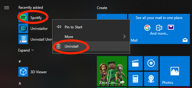 - Select the Windows key, right-click Spotify and select Uninstall.