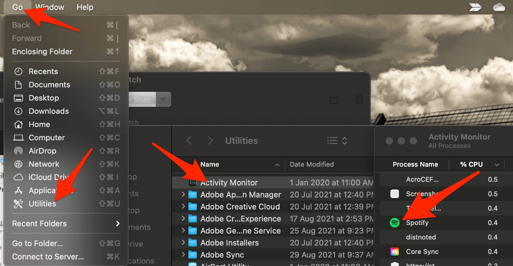 - On a Mac, select **Go** > **Utilities** > **Activity Monitor** > **Spotify** and then select the **X** mark to close the app.