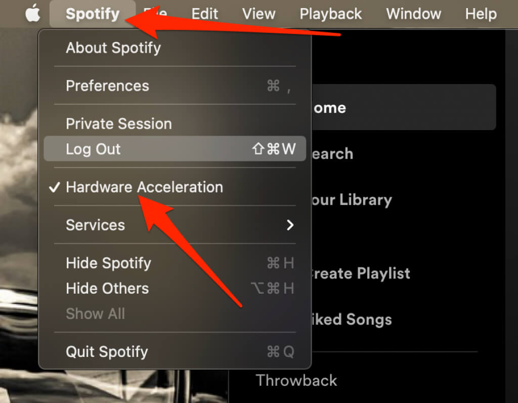 You can quickly disable the Hardware Acceleration setting on your Mac from the Spotify menu.
