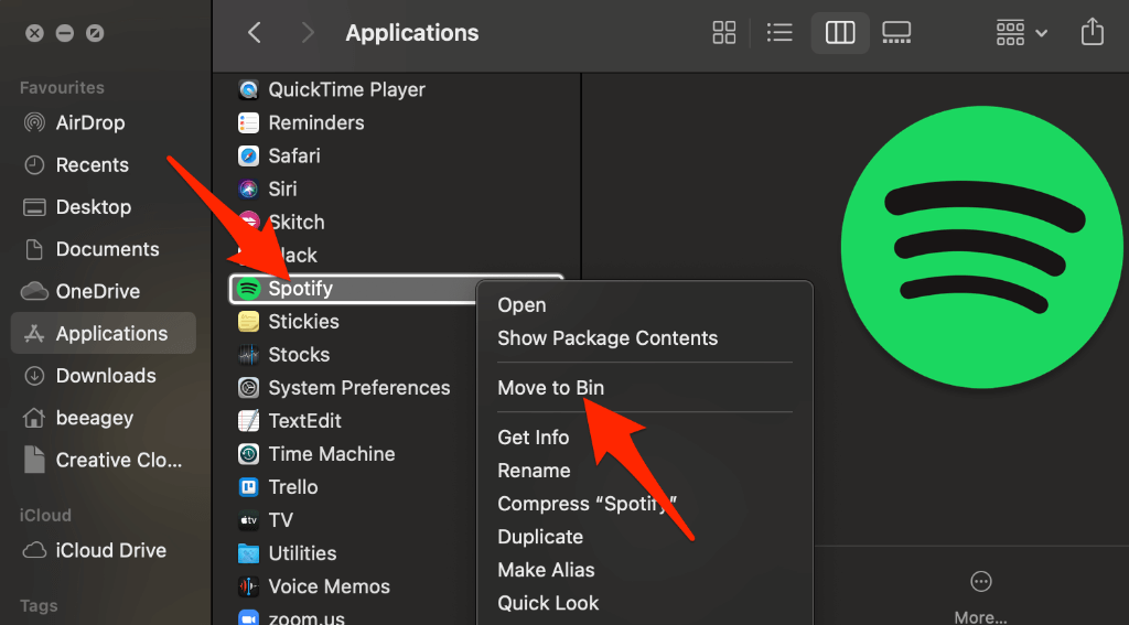 To uninstall the Spotify app on your Mac, you’ll need to move it to the trash first before reinstalling the app from the App Store.