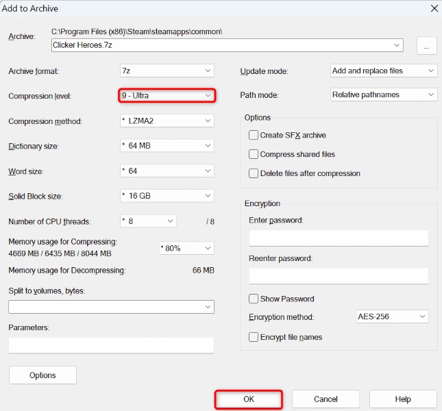 - Select 9 – Ultra in the Compression level drop-down menu.