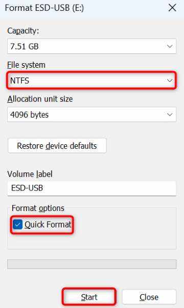- Enable the Quick Format option and select Start.