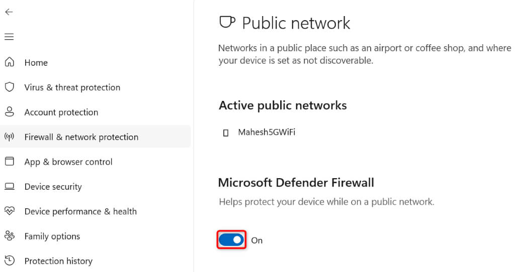 - Select Yes in the User Account Control prompt. * Begin disabling the firewall by first choosing Firewall & network protection in the left sidebar. * Select the network that says (active). * Turn off the Microsoft Defender Firewall toggle. This will turn off the Windows firewall.
