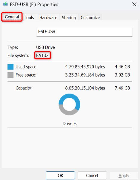 - Check the value next to File system. If the value says FAT32, your disk can’t support a single file larger than 4 GB.