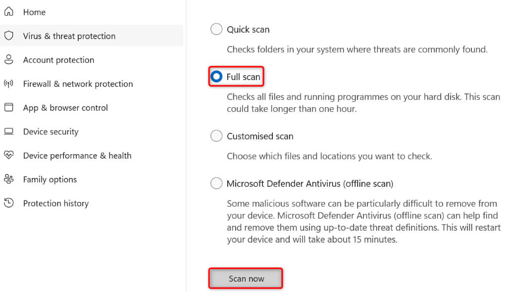 - Select Full scan and choose Scan now at the bottom.