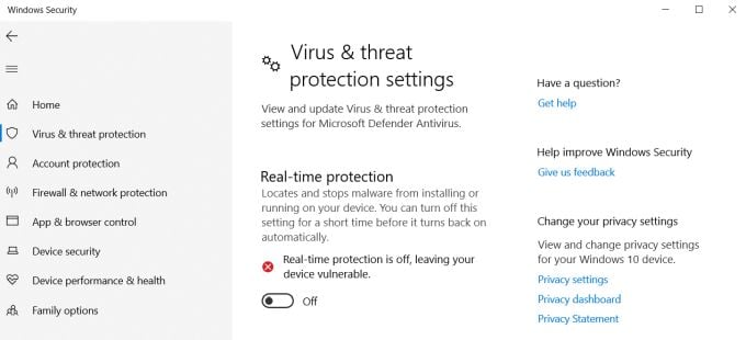 Then go to Windows Security > Virus & threat protection. Under Virus & threat protection settings, go to Manage settings. Here, find Real-time protection and set this to Off using the toggle switch.