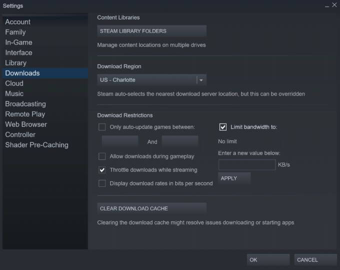 In this window, look at the Download Region section. Make sure the region is closest to where you’re actually located, as this will ensure the fastest download speeds. Another change we can make here is just below, where it reads Limit bandwidth to. Check this off to choose No limit, which will allow Steam to use the full extent of bandwidth needed to download your game.