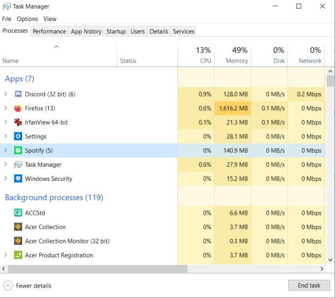 If you click More details, you can see which programs are running in the background. You can also see which programs are using your network connection by looking at the Network column. If another app is using a large percentage of it, you can close it by right-clicking the program and selecting End task.