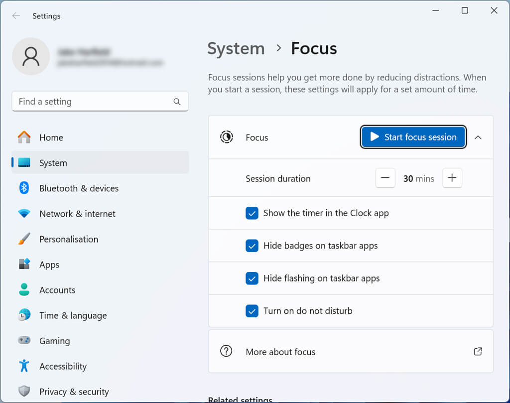 Like other widgets, you can only change the full range of settings from within the actual app. Open the Start Menu and search for “focus session,” then select Focus Settings. Here, you can change the duration of your focus sessions, how the timer appears, and what things you want to stop appearing on your screen during the session.