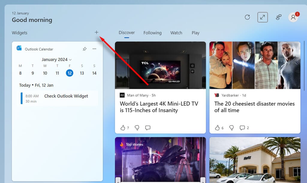 To access the widgets board, press the Windows key + W together. This will open a window that lets you see installed widgets and add new ones.