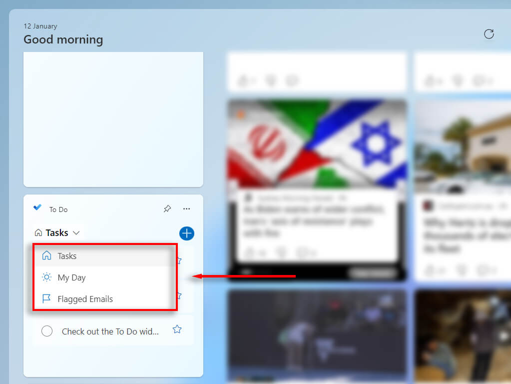 In the widget, you can select two different views: Task view, or My Day. The Task view lets you see a list of all of your tasks, while My Day shows you everything you need to get done today.