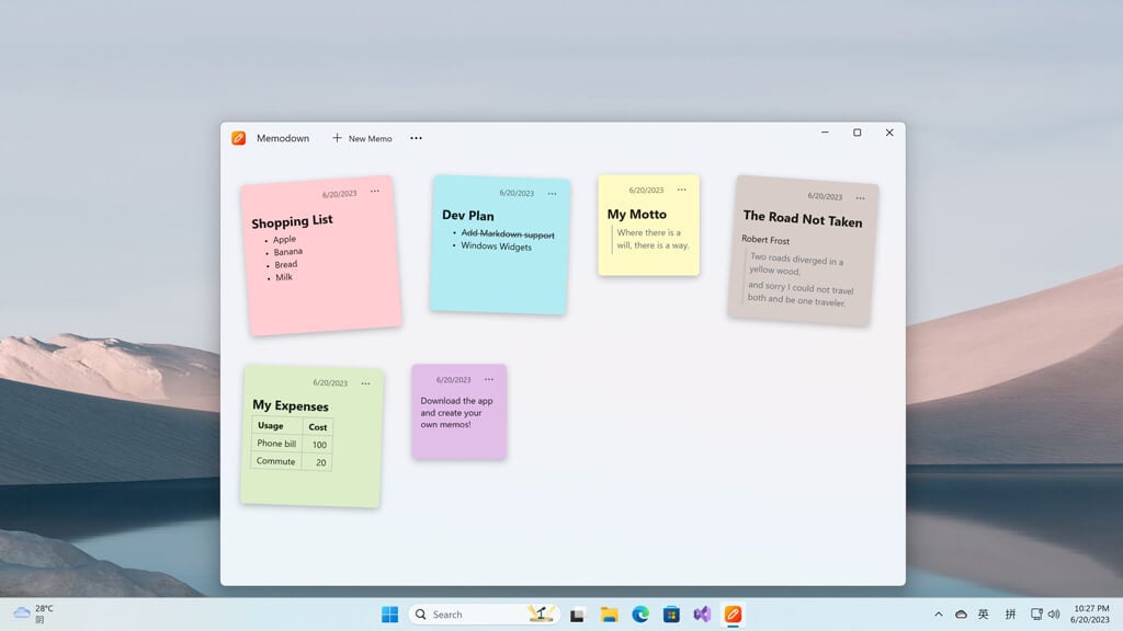 Memodown is a third-party widget (not made by Microsoft) that provides note-taking functionalities. It’s the perfect, lightweight alternative to Microsoft’s fully featured note-taking app, OneNote.