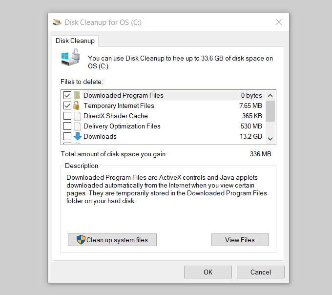See the screenshot above where it says: Total amount of disk space you gain: 336 MB. Scroll down to the Files to delete row and put a check in the box in front of the types of files you would like to delete. Then click OK.