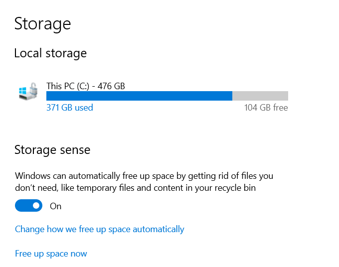 Windows 10 comes with a feature called **Storage Sense** that monitors your computer and automatically removes different types of files that are usually temporary.