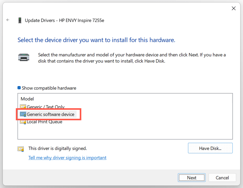 - Check the box next to Show compatible hardware. Then, select Generic software device > Next.