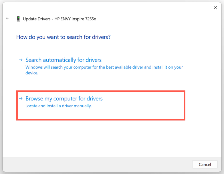 - Select Browse my computer for drivers on the Update Drivers dialog.
