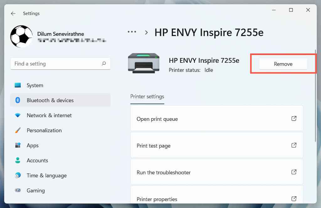 Choose your HP printer and select the Remove button to confirm. Then, select Remove device on the pop-up to confirm.