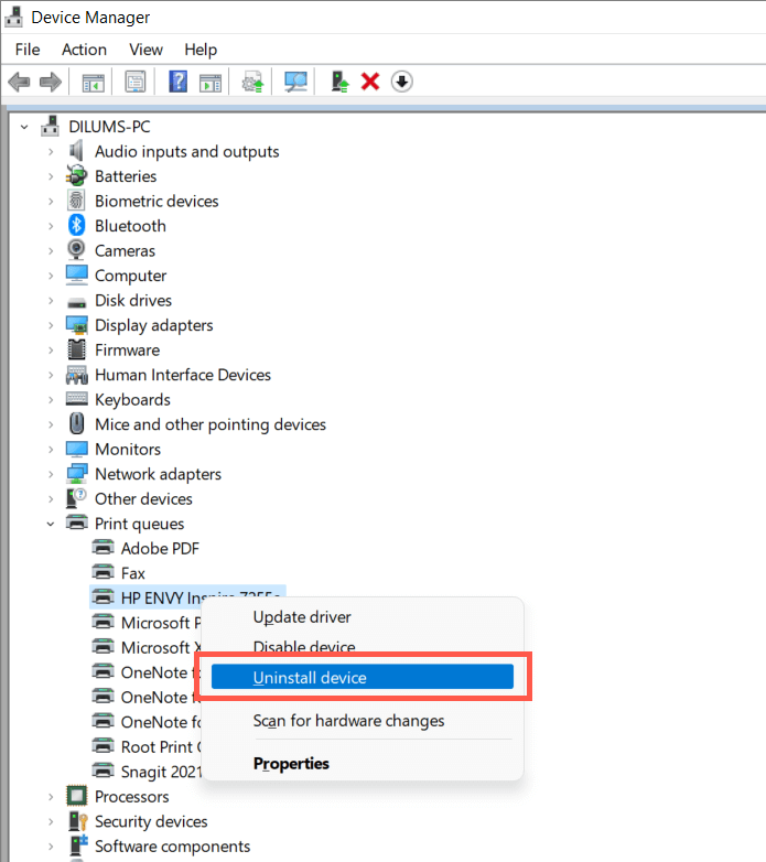 Expand Printer queues, right-click your HP printer, and select Uninstall device.