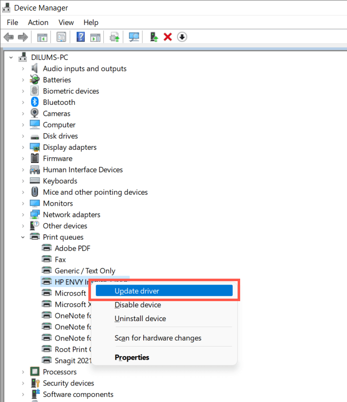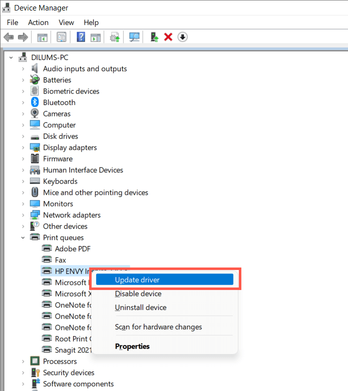 - Expand Print queues, right-click your printer hardware (e.g., HP ENVY), and select Update driver.