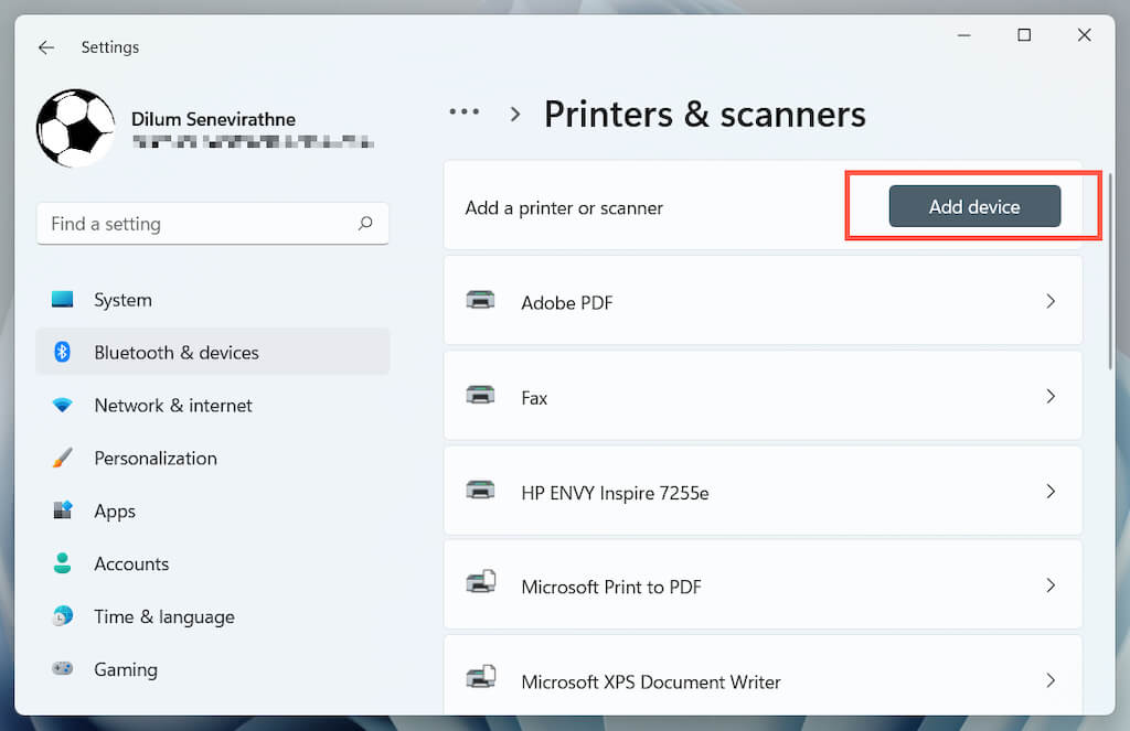 Open the Settings app and go to Bluetooth & devices > Printers & scanners.