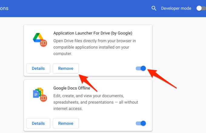 Move the toggle to the left to disable an extension, or tap the Remove button to uninstall the extension from Chrome.