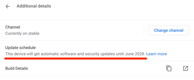 Remember to close your apps before restarting your device, so you don’t lose unsaved files and documents. If you’re unable to update your Chromebook, it has probably reached its Auto-Update Expiration (AUE) date. Go to Settings > About Chrome OS > Additional Details and check the Update schedule row to see your Chromebook’s Auto-Update Expiration date.