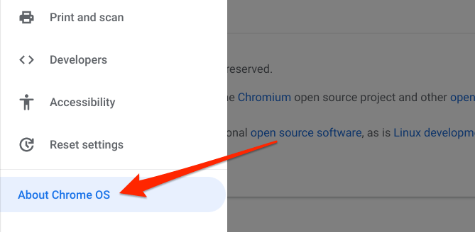- Launch the Settings menu and select About Chrome OS.